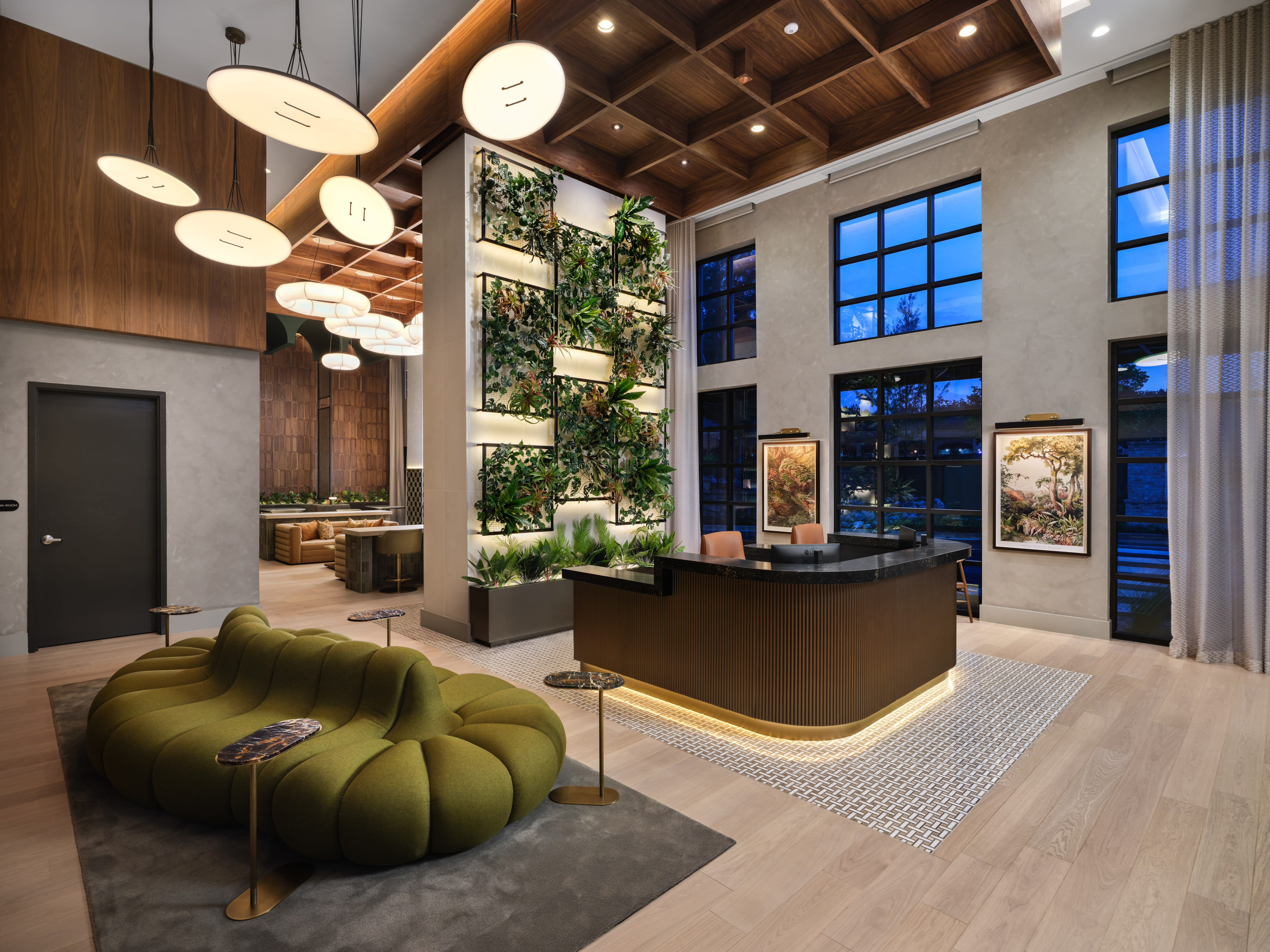 The communal spaces at Solis Peachtree Corners were designed to feel both welcoming and elevated. Soft green architectural detailing, rich walnut accents, and layered lighting create a warm, contemporary environment. The choice of Blanco in a platinum tone provides a calm and versatile foundation that complements the natural palette while enhancing the sense of openness.